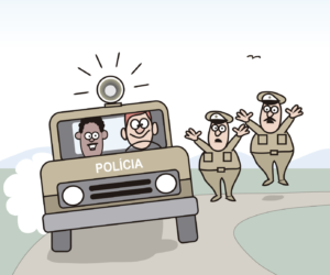 Os policiais disseram que não poderiam emprestar a viatura mas o Merenda não quis nem saber e já foi entrando na viatura e dando a partida. Um dos policiais ainda tento gritar “só não me liguem a sirene, piazada” mas era tarde. Ricardo já tinha feito a sirene soar duas vezes.
